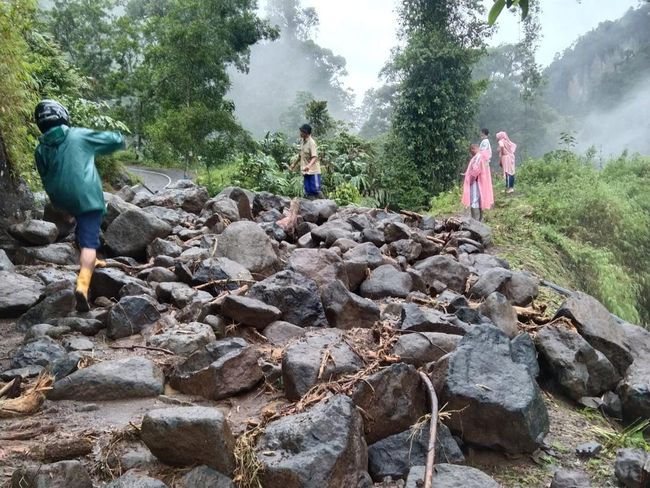 Jalan di Desa Sirau, Kecamatan Karangmoncol, Purbalingga, tertutup longsoran batu. Akibatnya jalan tidak bisa dilalui kendaraan roda dua maupun roda empat.