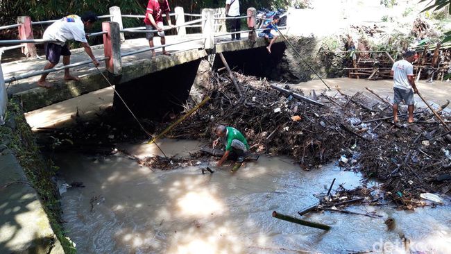 Sejumlah warga tampak bergotong royong menyingkirkan sedikit demi sedikit, sampah batang-batang bambu yang menumpuk di jembatan ini. Mereka berusaha menyingkirkan sampah-sampah itu agar aliran air sungai lancar.