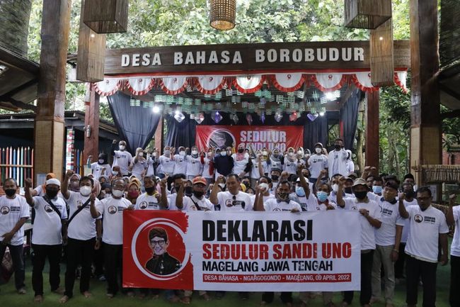 Ratusan relawan yang tergabung dalam Sedulur Sandi Uno Magelang mendeklarasikan dukungan terhadap Menteri Pariwisata dan Ekonomi Kreatif (Menparekraf) Sandiaga Uno menjadi Presiden 2024. Deklarasi tersebut dilakukan di Desa Bahasa Borobudur, Ngargogondo, Kecamatan Borobudur, Kabupaten Magelang, Jawa Tengah, hari ini. Peserta deklarasi terdiri dari milenial, petani, pelaku pariwisata, hingga pelaku UMKM.