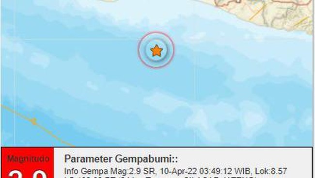 "Info Gempa Mag:2.9, 10-Apr-22 03:49:12 WIB," demikian dikutip dari akun resmi Twitter BMKG Daerah Istimewa Yogyakarta (DIY), @bmkgjogja, Minggu (10/4/2022).