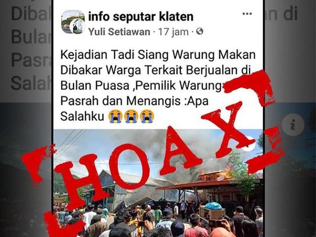 Abdillah menerangkan postingan warung dibakar itu disebarkan ke grup Facebook Klaten. Namun setelah diselidiki ternyata hoaks.