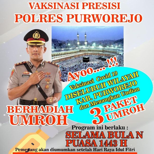 Untuk meningkatkan minat warga mengikuti vaksinasi, Polres Purworejo Jawa Tengah akan memberikan hadiah berupa umrah gratis. Hadiah akan diundi berdasarkan Nomer Induk Kependudukan (NIK) setelah Hari Raya Idul Fitri 1443 H.