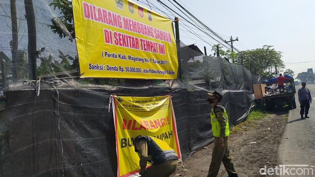 Petugas kemudian memasang spanduk dengan warna dasar kuning dan tulisan warna merah. Dalam spanduk tersebut dicantumkan logo Pemprov Jateng, Pemkab Magelang, TNI dan Polri. Kemudian tulisan warna merah berbunyi 'Dilarang membuang sampah di sekitar tempat ini' Perda Kab Magelang No 7 tahun 2017. Sanksi : denda Rp50.000.000 atau pidana kurungan 3 bulan. Perda tersebut mengatur tentang pengelolaan sampah.