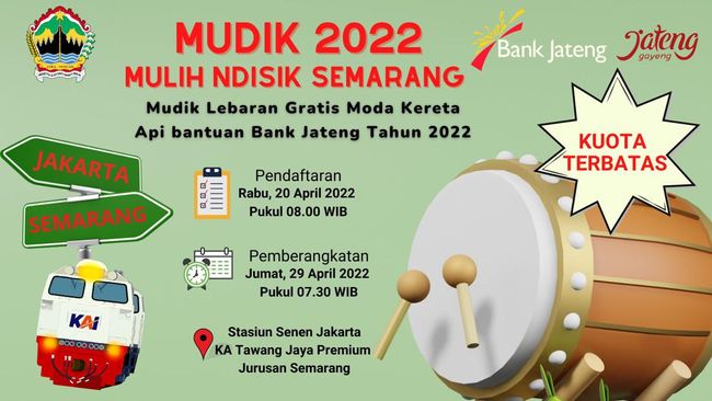Mengutip akun Twitter Badan Penghubung Provinsi Jateng, Rabu (20/4/2022), acara ini digelar gratis. Para peserta wajib membawa KTP Jawa Tengah atau kelahiran Jateng yang ditunjukkan dengan fotokopi KK.