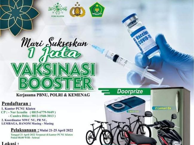 Kegiatan vaksinasi ini digelar PBNU, Polri dan Kemenag. Pendaftaran peserta vaksinasi ini bisa dilakukan di kantor PCNU Klaten maupun di koordinator MWC NU, PR NU, lembaga dan Banom masing-masing. Pelaksanaan vaksinasi dimulai 21-25 April 2022.