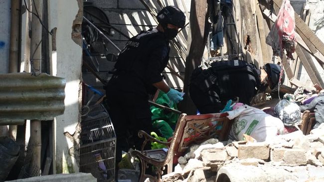 Sebuah rumah rata dengan tanah akibat ledakan di Plosokuning V, Minomartani, Ngaglik, Sleman. Tim Gegana Polda DIY pun melakukan penyisiran di lokasi ledakan. Apa hasilnya?