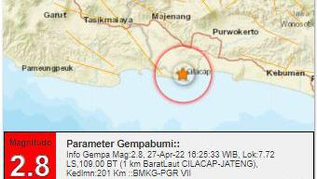 Gempa bumi berkekuatan magnitudo 2,8 terjadi di Cilacap, Jawa Tengah. Gempa ini berpusat di darat.