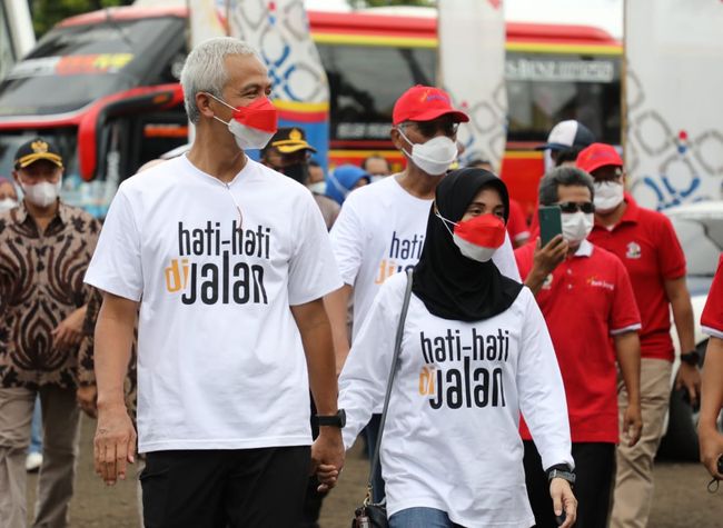 Gubernur Jawa Tengah Ganjar Pranowo melepas ribuan pemudik Jateng dari Taman Mini Indonesia Indah, hari ini. Ganjar pun muncul dengan kaos unik bertuliskan 'Hati-Hati Di Jalan'.