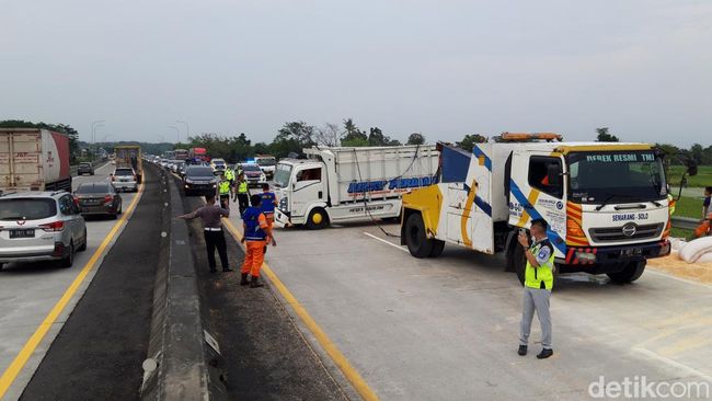 Antrian kendaraan tampak sedikit mengular saat proses evakuasi truk bermuatan jagung itu. Setelah truk berhasil dievakuasi dari tengah jalan, arus lalulintas di jalan tol Semarang-Solo jalur B atau dari arah Solo menuju Semarang itu pun normal lagi.