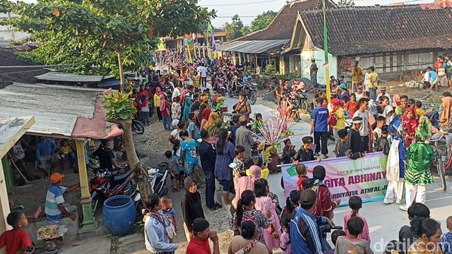 Ribuan warga ini duduk, berdiri dan bahkan lesehan di jalan beton baru yang dibangun atas donasi Joko Suranto. Banyak penjual makanan, jajanan dan mainan juga menikmati momen keramaian warga ini.