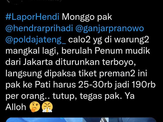 "#LaporHendi Monggo pak @hendrarprihadi @ganjarpranowo @poldajateng_ calo2 yg di warung2 mangkal lagi, berulah Penum mudik dari Jakarta diturunkan terboyo, langsung dipaksa tiket preman2 ini pak ke Pati harus 25-30rb jadi 190rb per orang. tutup, tegas pak. Ya Alloh 🤔😤," tulis pemilik akun.