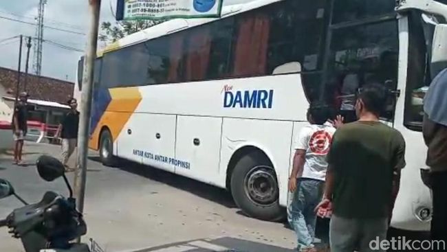 Satu unit bus Damri tiba-tiba muncul di jalan Desa Terlangu, Brebes, Jawa Tengah siang ini. Kemunculan bus itu bikin kaget karena lokasi yang dilalui bus dikenal sempit dan menuju ke arah tanggul Sungai Pemali.