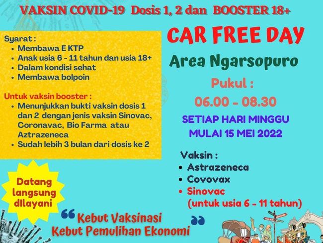 Ning menambahkan, masyarakat yang ingin vaksin 1, 2, atau booster saat CFD di Ngarsopuro syaratnya hanya membawa e-KTP, berumur 18 tahun ke atas atau berumur 6-11 tahun.