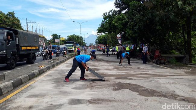 Setelah truk trailer dipinggirkan dan puing kendaraan disingkirkan, jalan di TKP itu kemudian ditutup pasir untuk menghilangkan ceceran oli dan solar.