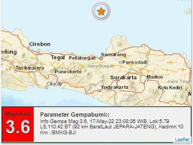 Gempa bumi bermagnitudo 3,6 terjadi di barat laut Kabupaten Jepara, Jawa Tengah. Menurut BMKG, gempa itu terjadi pada Selasa (17/5/2022) pukul 23.08 WIB.