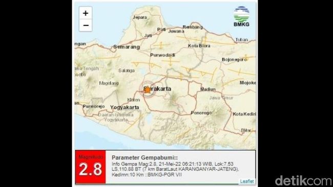 Gempa darat berkekuatan magnitudo 2,8 terjadi di wilayah Kabupaten Karanganyar, Jawa Tengah. Gempa ini berpusat di kedalaman 10 kilometer.