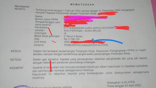Sebelumnya diberitakan, besaran gaji pokok yang tercantum di surat keputusan (SK) milik sebagian besar pegawai pemerintah dengan perjanjian kerja (PPPK) guru di Kabupaten Klaten nominalnya ternyata keliru. Padahal SK tersebut sudah diserahkan kepada PPPK sebanyak 1.977 orang.