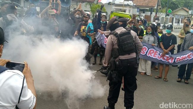 Demo yang digelar di depan kantor bupati itu sempat diwarnai dengan aksi bakar ban. Polisi langsung mencegahnya dengan melakukan penyemprotan menggunakan alat pemadam api.