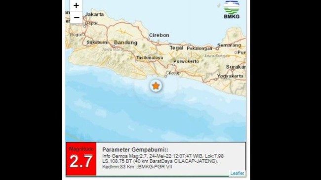 Gempa bumi berkekuatan magnitudo (M) 2,7 kembali terjadi di wilayah Cilacap, Jawa Tengah. Gempa ini berpusat di perairan barat daya Cilacap.