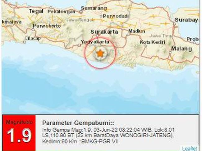 "Info Gempa Mag:1.9, 03-Jun-22 08:22:04 WIB," demikian dikutip dari akun resmi Twitter BMKG Daerah Istimewa Yogyakarta (DIY) @bmkgjogja, Jumat (3/6/2022).