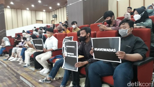 Ganjar awalnya memberikan pemaparan dalam talk show bertajuk Peran UMKM dalam Membangun Kemandirian Ekonomi Melalui Transformasi Digital. Tiba-tiba sejumlah mahasiswa di lantai atas mengangkat poster hitam bertuliskan #SAVEWADAS dan #WADASMELAWAN.