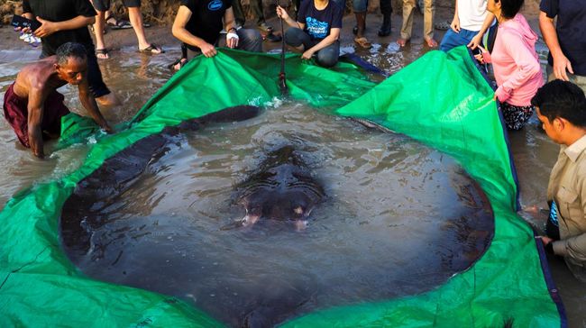 Seorang nelayan di Kamboja menangkap seekor ikan pari raksasa di Sungai Mengkong, Kamboja. Tidak tanggung-tanggung berat ikan dengan ekor panjang ini bahkan mencapai 300 kilogram.