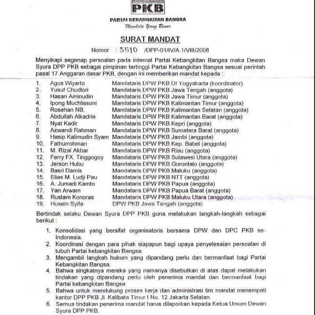 detikJateng mendapatkan copy Surat Mandat tersebut ditandatangani Gus Dur dan Muhyidin Arubusman selaku Ketua dan Sekretaris Dewan Syura DPP PKB saat itu. Dari daftar nama-nama yang ditunjuk, hanya Hussein Syifa yang tanpa atribusi. Sedangkan 18 anggota lainnya adalah para pimpinan DPW PKB yang dibekukan kepengurusannya oleh Muhaimin. Tim tersebut dipimpin oleh Ketua DPW PKB DIY saat itu, Agus Wiyarto.