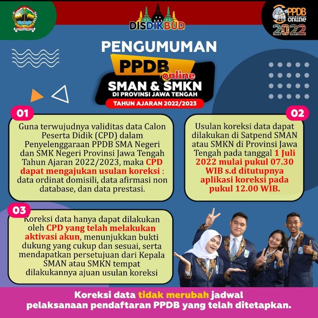 Panitia Penerimaan Peserta Didik Baru (PPDB) Jateng Tahun 2022 membuka kesempatan bagi calon peserta didik (CPD) untuk melakukan koreksi data di hari terakhir pendaftaran, 1 Juli 2022.