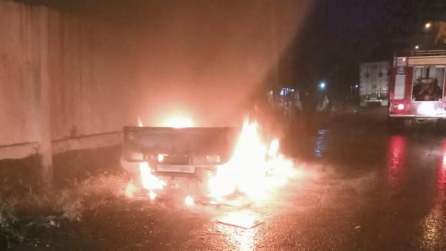 Dalam foto yang diterima, tampak seluruh bagian mobil itu dilalap api. Api pun terlihat membara di tengah kegalapan.