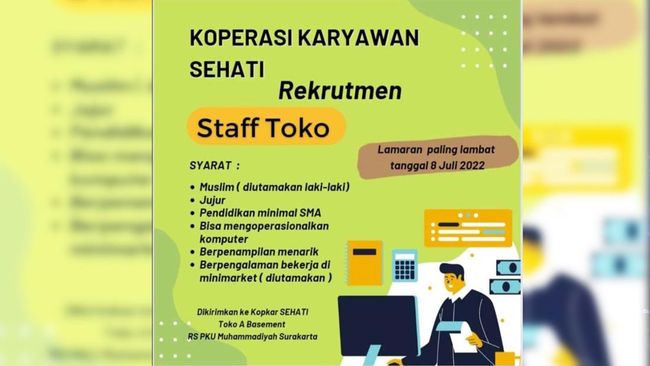 Koperasi Sehati Solo membuka lowongan kerja untuk tenaga staf toko. Pelamar bisa langsung mengirimkan berkasnya ke kantor koperasi yang berada di RS PKU Muhammadiyah Solo.