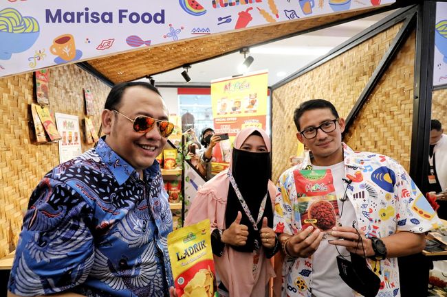 Menteri Pariwisata dan Ekonomi Kreatif Sandiaga Uno menghadiri acara Apresiasi Kreasi Indonesia (AKI) di Tegal, Jawa Tengah pada hari Minggu (3/7). Dalam kesempatan tersebut, Sandiaga mencicipi produk olahan Marisa Food milik salah satu peserta, Ibu Yelfia (38).