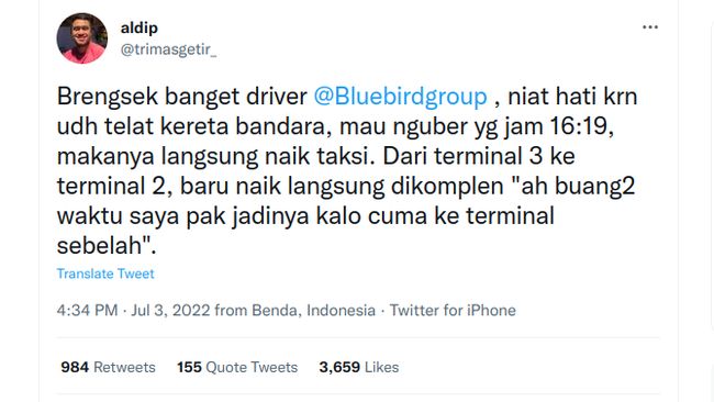 Media sosial dihebohkan dengan unggahan seorang penumpang taksi Blue Bird bernama Aldi yang mengaku diputar-putar oleh sang sopir. Melalui akun Twitter @trimasgetir_ dia mengunggah pengalamannya ketika naik taksi dari terminal 3 menuju kereta 2.