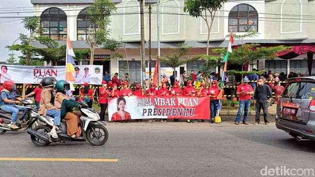 Emak-emak yang tergabung dalam Srikandi Barisan Relawan Jalan Perubahan (Bara JP) membentangkan spanduk bertuliskan '2024 Mbak Puan Presidenku'. Selain itu mereka juga menyanyikan yel-yel dukungan terhadap Putri Megawati itu.