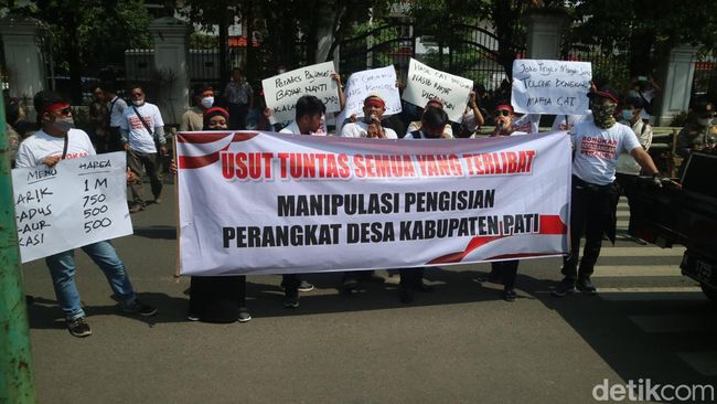 Belasan warga Pati yang tergabung dalam forum calon perangkat desa gagal (Capraga) menggelar aksi demo di depan Kantor Bupati dan DPRD. Mereka mendesak dilakukannya pengusutan dugaan jual beli jabatan pengisian perangkat desa tahun ini.