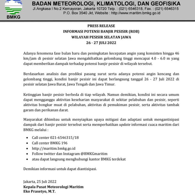Badan Meteorologi, Klimatologi, dan Geofisika (BMKG) memberikan peringatan tentang potensi banjir pesisir (rob) di pesisir selatan Jawa, 26-27 Juli 2022. Tinggi gelombang laut bisa mencapai 4 hingga 6 meter. Warga diminta menyiapkan langkah mitigasi.