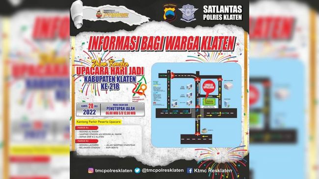 "Terkait upacara hari jadi Kabupaten Klaten, nanti pesertanya sekitar 4.000 orang. Untuk penutupan mulai dari samping Makodim (Jalan Tentara Pelajar) ke arah Stadion," terang Kasi Dalops Lalu Lintas Dinas Perhubungan, Nunung Wahyu Dwiningsih kepada detikJateng, Rabu (27/7/2022) sore usai rapat koordinasi.