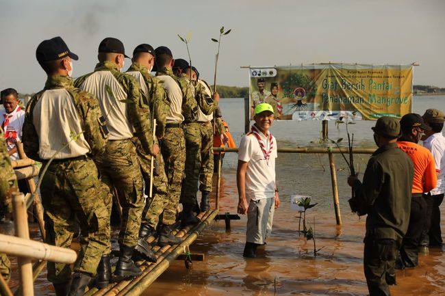 Dalam kesempatan itu, Ganjar bersama Kwartir Daerah (Kwarda) Pramuka Jateng, TNI, Perhutani, dinas, serta mahasiswa menanam 3.500 mangrove dan pohon cemara di Pantai Mangunharjo dalam rangka Bulan Bakti Pramuka.