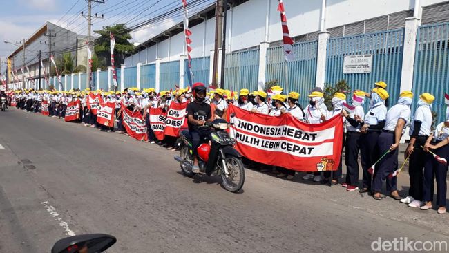 Kunjungan kerja (kunker) Presiden Joko Widodo di Kabupaten Sukoharjo mendapat sambutan dari karyawan PT Sri Rejeki Isman (Sritex). Mereka berjajar di tepi jalan hingga sepanjang 1 kilometer.