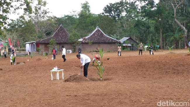 Presiden tiba pukul 11.30 WIB dan langsung menuju ke tempat penanaman pohon. Menggunakan sekop, Jokowi pun memasukkan tanah ke dalam lahan yang disiapkan.