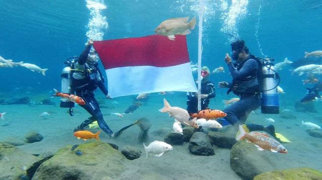 "Ya tadi kaget kok ada upacara, ternyata pengibaran bendera di tengah kolam. Benderanya dari bawah air," kata Diki kepada detikJateng.