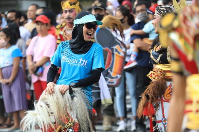 Di antara para penari, hadir pula istri Gubernur Jawa Tengah Siti Atikoh Ganjar Pranowo. Atikoh ikut menari jaranan dengan semangatnya di acara yang didukung Bank Jateng dan Purnomo Yusgiantoro Center.