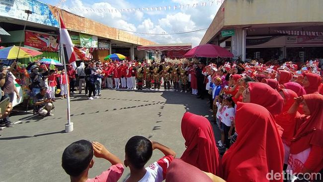 Suasana berbeda terlihat di Pasar Rejowinangun, Kota Magelang, Jawa Tengah, hari ini. Para pedagang di pasar tersebut menggelar upacara HUT ke-77 RI dan mengadakan acara gunungan barang dagangan.