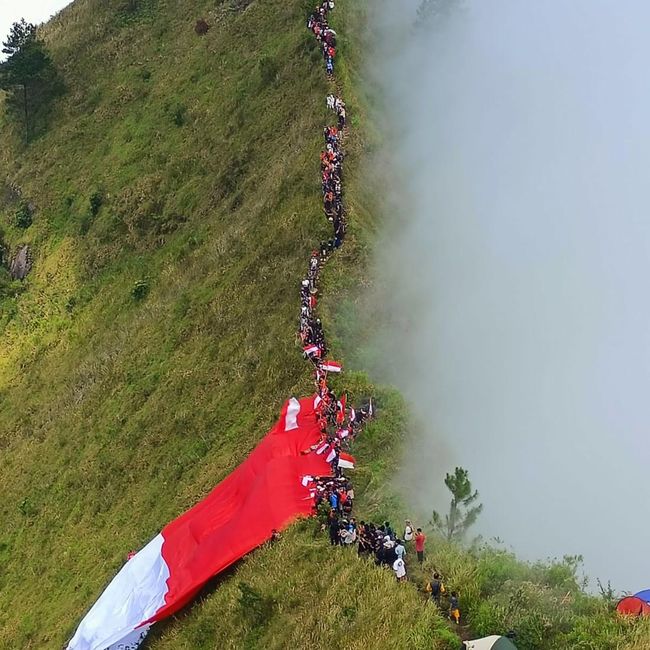 Bendera Merah Putih berukuran raksasa membentang di Puncak Gunung Andong, Kabupaten Magelang. Bendera berukuran panjang sekitar 20 meter itu dibentangkan oleh para pendaki yang memadati puncak alap-alap Gunung Andong.