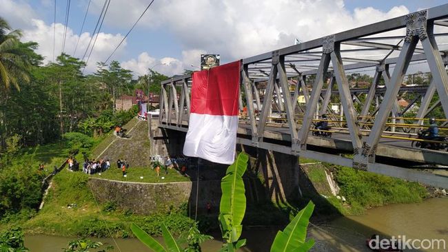 Puluhan relawan di Magelang Raya mengibarkan Bendera Merah Putih raksasa di Jembatan Canguk, Kota Magelang, Jawa Tengah. Pengibaran bendera Merah Putih ini dilakukan dengan teknik repling.