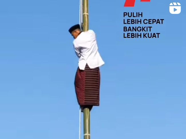 Pada rekaman terlihat seorang santri di pucuk tiang bendera terbuat dari bambu. Santri laki-laki itu berbaju putih dengan sarung merah kotak-kotak.