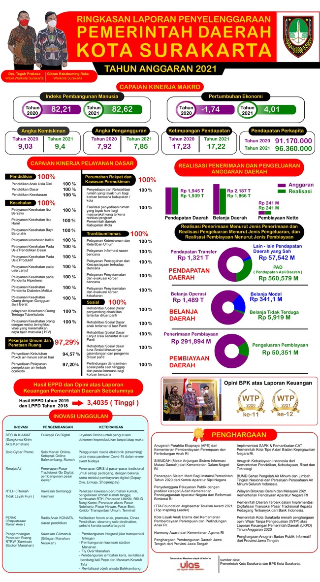 Jakarta - Pemerintah Daerah Kota Surakarta mengeluarkan ringkasan laporan penyelenggaraan tahun anggaran 2021. Dalam ringkasan laporan tersebut, tercatat capaian kinerja makro, realisasi penerimaan dan pengeluaran anggaran daerah, inovasi unggulan, hingga penghargaan.