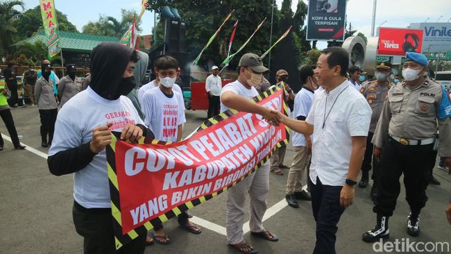 Tampak Sam'ani Intakoris menemui para pendemo. Sekda Kudus itu pun tidak canggung menyalami satu per satu peserta aksi demo tersebut.