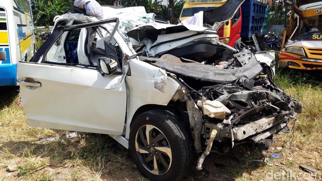 Kecelakaan ini dialami mobil MPV Honda Mobilio bernomor polisi B 2888 CO. Mobil warna putih itu ringsek berat.