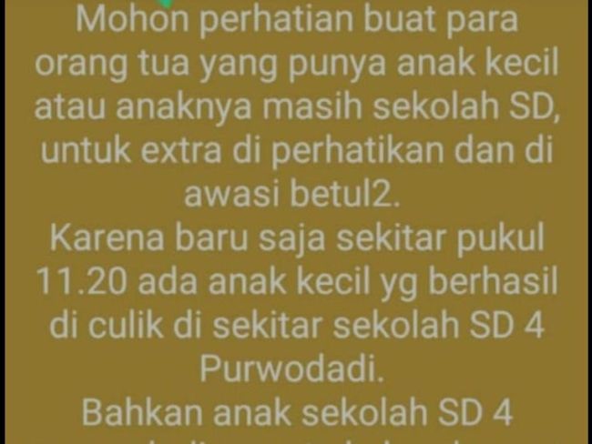 Bahkan anak sekolah SD 4 purwodadi yg satu kelas dengan anak saya juga hampir menjadi korban penculikan. Untungnya si anak SD tersebut melarikan diri masuk ke sekolahan dan melaporkan kepada gurunya. Mohon untuk menjadi perhatian para orang tua," tulis pesan yang viral tersebut.