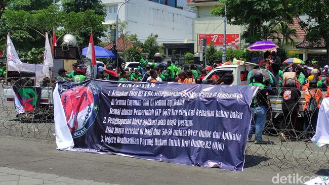 Massa dari berbagai organisasi driver ojek online (ojol) dan taksi online mendatangi kantor Gubernur Jawa Tengah Ganjar Pranowo. Mereka menuntut beberapa hal terkait kesejahteraan para driver online.